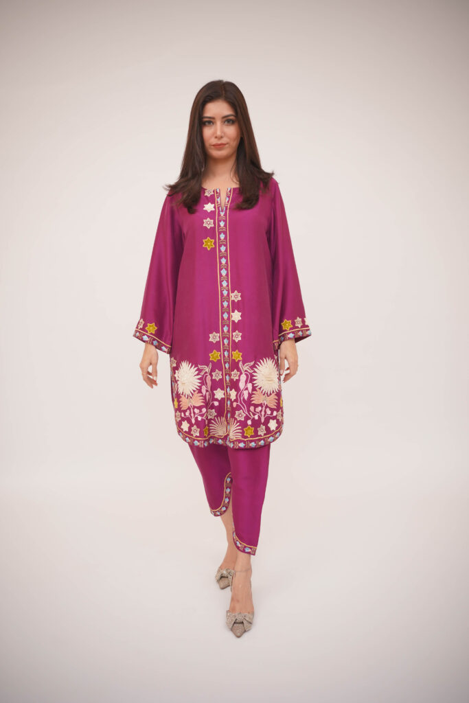 Collection #01 MADE TO ORDER; PLUM SILK/POLYESTER SHIRT WITH RESHAM WORK WORN OVER SHORT SHALWAR. READY TO DELIVER IN 15 DAYS. DELIVERY; 5 WORK DAYS PLUM PURE SILK SHIRT & SHALWAR WORK; RESHAM THREAD WORK PRICE; PKR 45000.00 DELIVERY; 1150 ORDER NOW