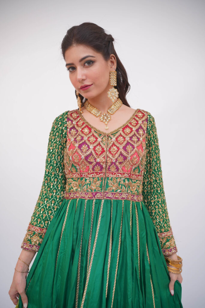 Collection #07 DRESS DESCRIPTION; M.T.O, SEA GREEN BANARSI SILK PISHWAZ WITH NARROW PANTS REDAY TO DELIVER; TREE WEEKS (+,-) 3 DAYS Fabric Details; Banarsi Silk Linings; breathable materials. Work and Embellishment; Hand embroidery, Applique, Price; PKR.245000 shipping inland; PKRs.1500 ORDER NOW